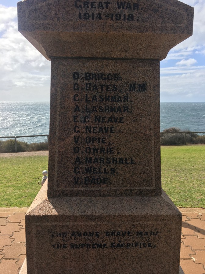 I made a commitment to look up some of the names on the memorial when I got home to try and find out more and picked what I assumed to be two brothers, a C Lashmar and A Lashmar. My search was very easy as I found them on this website http://ww1sa.gravesecrets.net/lar—laz.html. They were indeed brothers and one was born in American River where we had taken lunch earlier that day. Both had fought in Gallipoli, one died there and the other surviving to later be killed in action in France. The ultimate sacrifice that isn’t forgotten, and never will be, here on Kangaroo Island or where they fell in Europe.