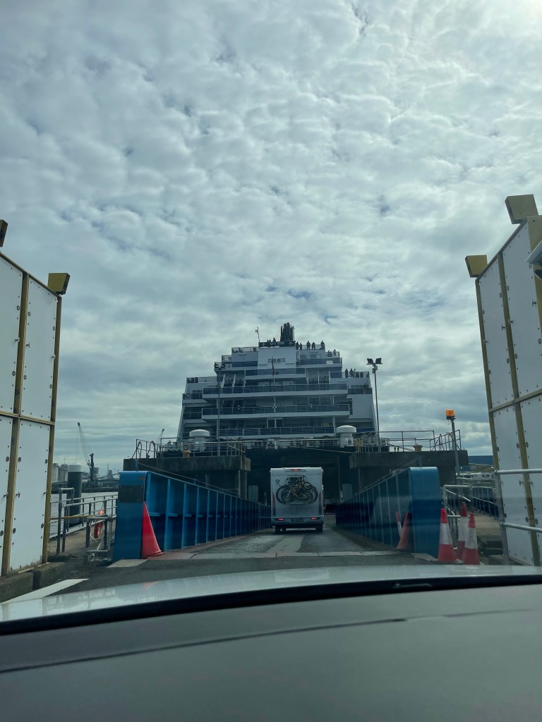 Boarding was incredibly easy, the only issue being that the ticket booth guy told us that there was no longer, post covid, a shop and café at the terminal. Our plan to buy the required “UK” car sticker and light reflectors was scuppered and we ran the risk of being on the run around Europe as a result.