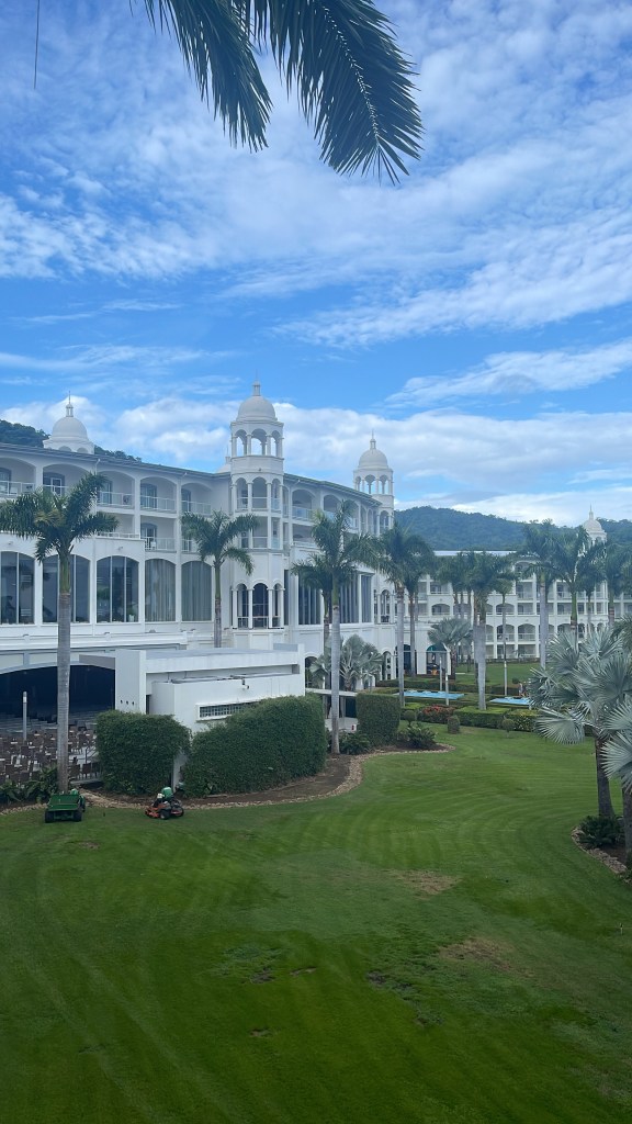 We had a grand bath in the middle of the room and a balcony with perfect views of the perfectly manicured gardens and lush green mountains cupping the hotel towards the Pacific Ocean below us. We had branded spirits hanging from optics in the room and a fridge filled with mixers and beers aplenty. There was no need for the kids to hide their underage drinking as our wristbands allowed unlimited branded drinks from the various bars around the hotel.